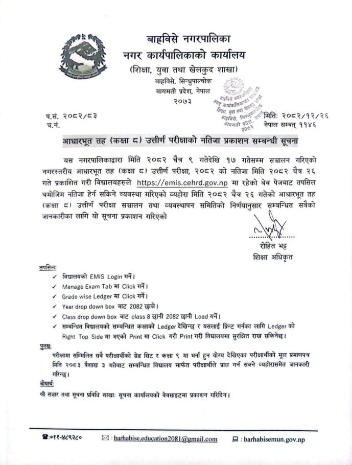 कक्षा ८ काे नतिजा प्रकाशन सम्बन्धमा ।