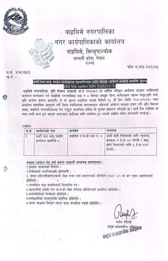 कफी तथा आलु प्रवर्द्धन कार्यक्रममा प्रस्ताव पेश सम्बन्धमा ।