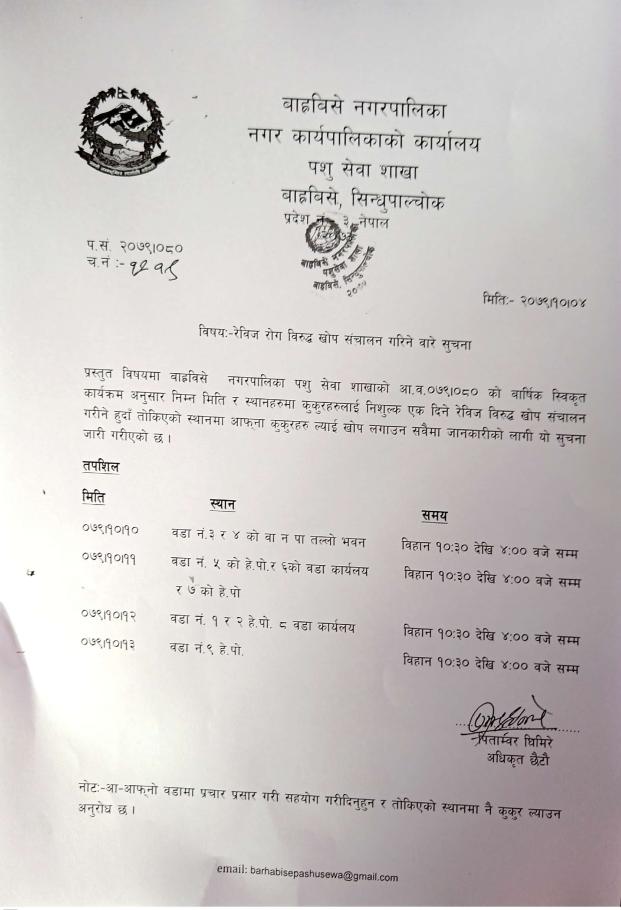 रेविज राेग विरूद्व खाेप संचालन सम्बन्धी सूचना ।