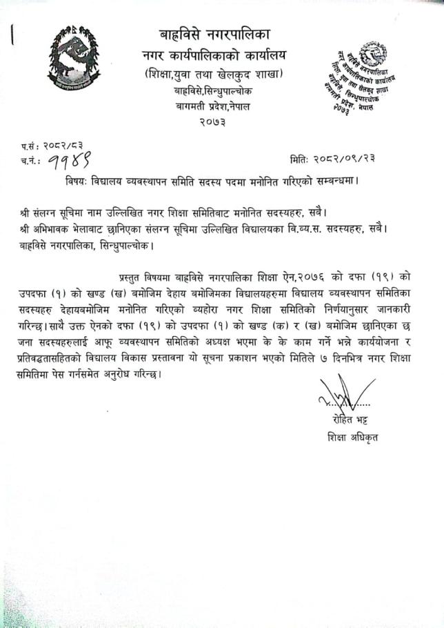 Home » विद्यालय व्यवस्थापन समिति सदस्य पदमा मनोनित गरिएको सम्बन्धमा ।