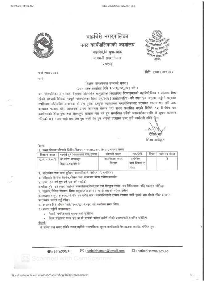 शिक्षक आवश्यकता ।